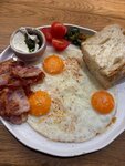 Английский завтрак! Завтрак настоящего чемпиона - это обжаренный сочный бекон, сосиски, молодой картофель, подаём с глазуньей из 2х яиц и соусом на основе грузинского