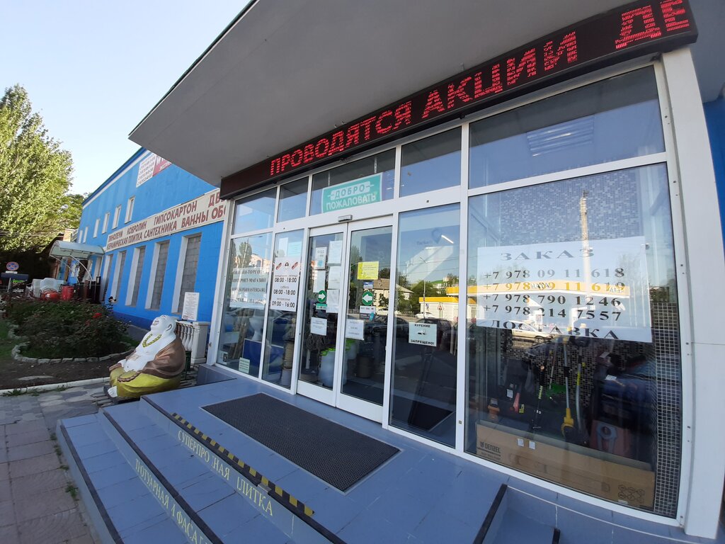 Отличный магазин с богатым ассортиментом строительных товаров.Очень хороший выбор линолиума,сантехники,дверей,плитки,краски,а также комплектующих.Довольно популярный магазин в г.Феодосия.
