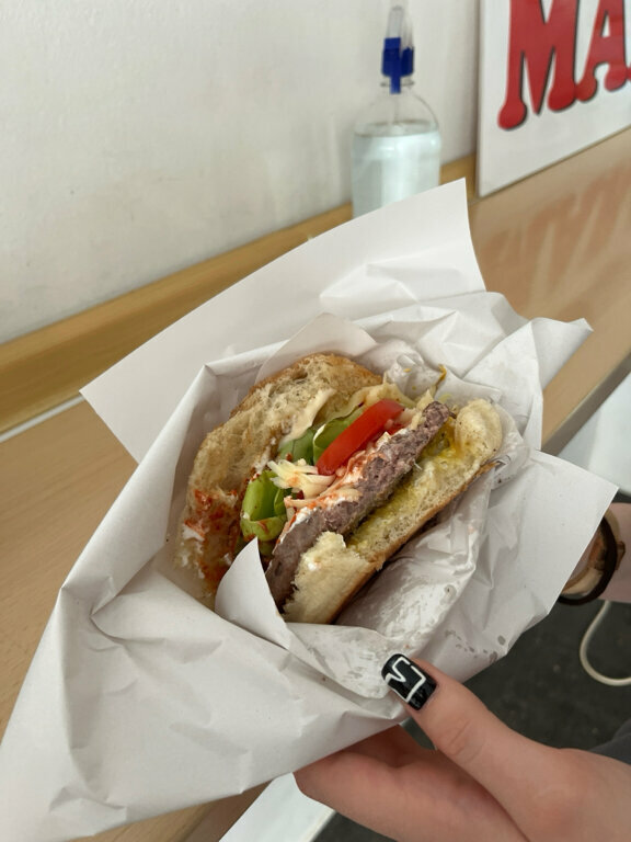 A huge burger, we put everything we had in there + we were given pancakes as a gift with us. Very friendly people. I advise everyone that one maximum burger cost 550 dinars.