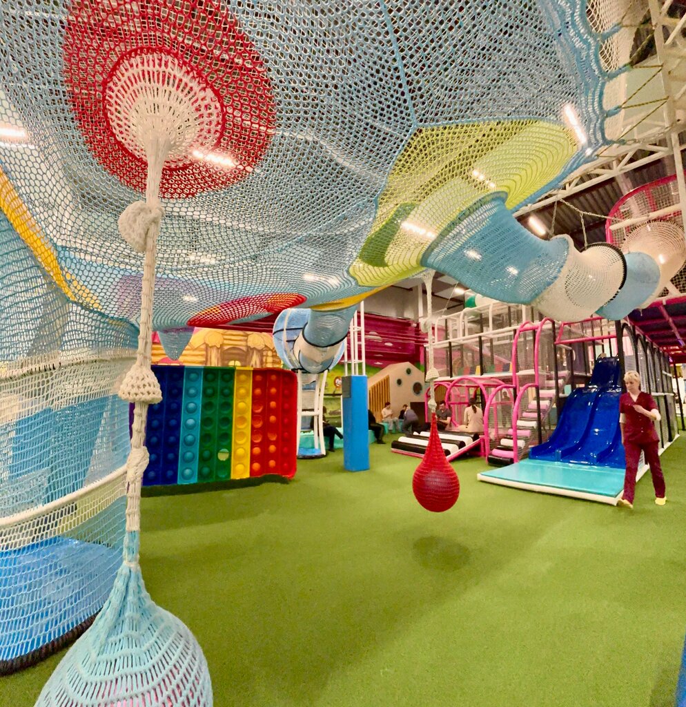 Очень приятный местечковый игровой центр! Новенький, чистенький, не затертый, везде помыто и убрано, чистые шары в бассейне, везде приятно пахнет — ни в одном месте не возникло ощущения брезгливости, что лично для меня очень важно в подобных местах👍 Площадь небольшая, но есть все, что нужно, причем оптимальный набор для деток условно 3-7 лет. 4 батута + яма с кубиками, бассейн с шариками и интерактивной игрой, мелкие активности типа огромного поп-ит… Достаточно большой многоярусный лабиринт, горка аля мини-скалодром. Малышковая зона. Есть также комнатка с пуфами и мультиками и импровизированный «огородик», где можно «посадить» плюшевые овощи. Самый дорогой билет в выходные — 900 рублей, безлимитный, взрослые бесплатно. В будни дешевле. Персонал вполне приятный и приветливый. Туалет нам не понадобился, были пару часов, но визуально его там не было — видимо, и правда в ТЦ, это конечно, неудобно (