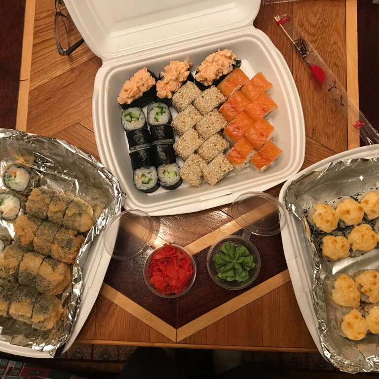 Variety of food:sushi and rolls, pizza, fixed meal, сhinese food