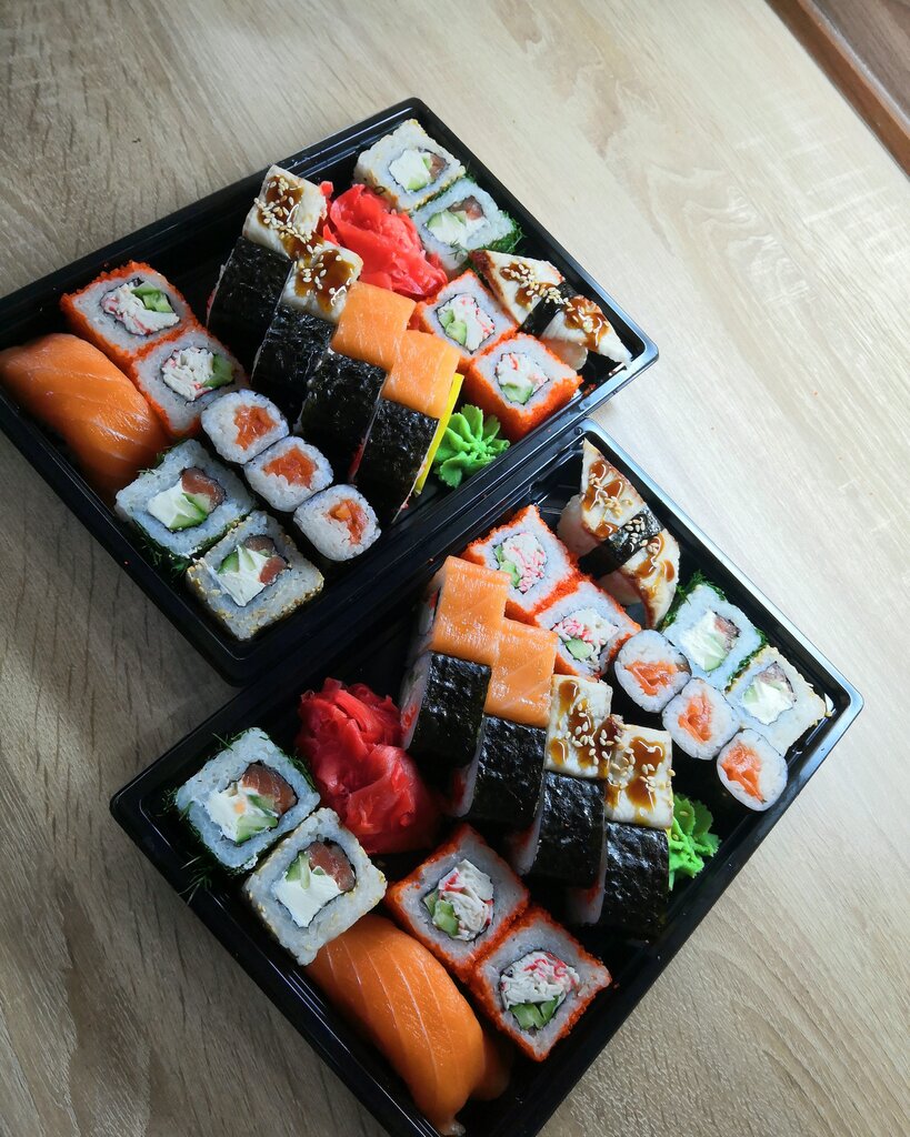 Просто шел с работы. Случайно зашёл. Заказал с доставкой. Звонок. Добрый вечер - доставка. Не эй. Не я приехал забери. Далее. Открываем. С виду все смотрится просто и аккуратно. Имбирь и вассаби не ляпнуто в угол а интересно размещено между кубиками. Мелочь, но эстетично. Главное. Честно, я аболдел. Рис рассыпчатый. Хорошие продукты как мне видится, отчетливо каждый по вкусу угадывается. Пример: кушаю один, немного острый с целой креветкой, другой нежный с сыром, еще один запеченый чуть хрустящий. Это тонкую грань вкусовых впечатлений удалось почувствовать и различить. Демократичные цены. До тысячи вполне можно поужинать на двоих. Мое уважение, было правда вкусно.