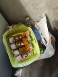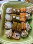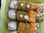 Роллы свежие и очень вкусные, не сухие. Брали с собой, идет в комплекте с палочками, васаби и имбирем, салфеточки положат и подарочек в честь дня рождения сделают!