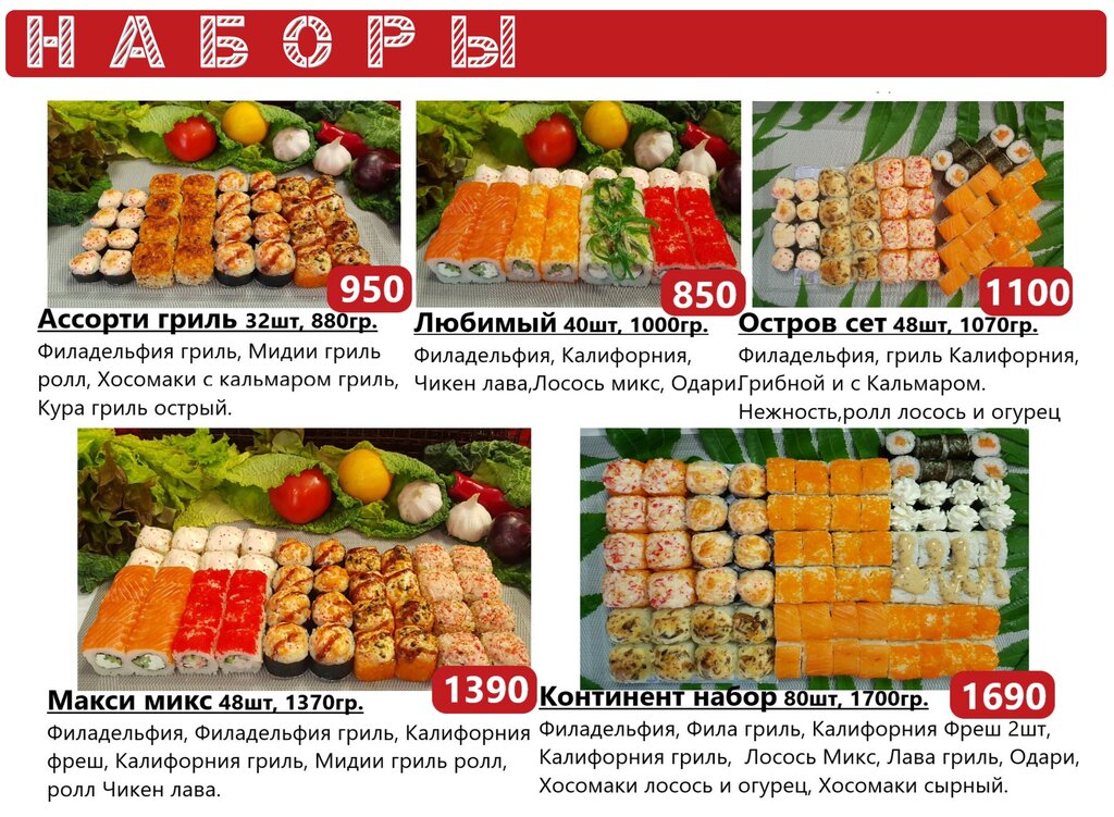 Variety of food:sushi and rolls, fixed meal, сhinese food