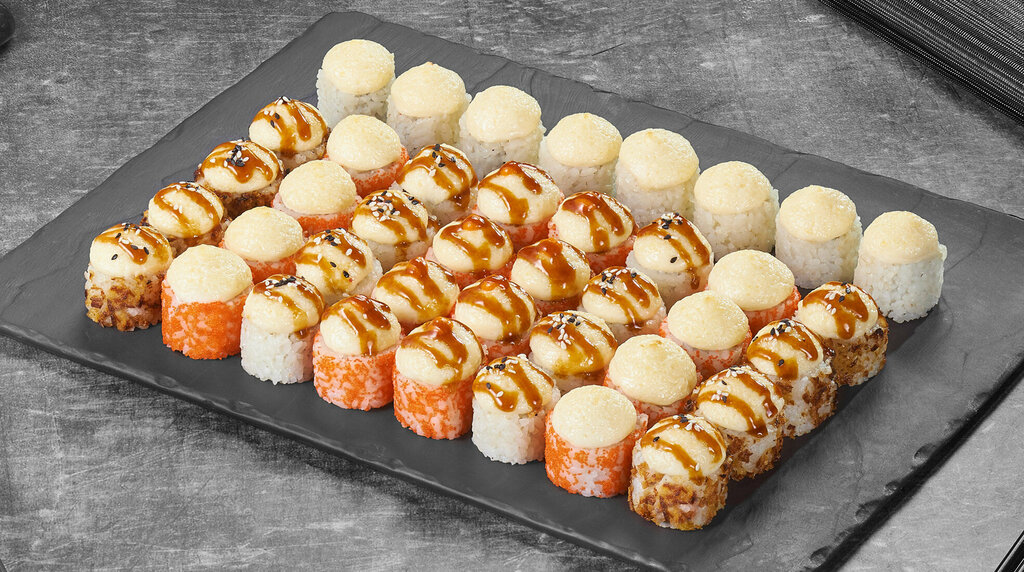 Ролл Филадельфия лайт сяке (8 шт.), ролл Калифорния в кунжуте (8 шт.), ролл Лава с лососем (8 шт.), ролл Куритос (8 шт.), ролл Дон бекон (8 шт.), ролл Монако запеченный (8 шт.), ролл Нежный с курицей запеченный (8 шт.), ролл Калифорния темпура (8 ...
