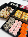 Ролл Калифорния микс (8 шт), Ролл Калифорния в кунжуте (8 шт), Ролл Лава с лососем (8 шт), Ролл Куритос (8 шт), Ролл Бекон монако хот (мини) (8 шт), Цезарь ролл запеченный (8 шт), Ролл Нежный с курицей запеченный (8 шт), Ролл Крабстер темпура (8 ш...