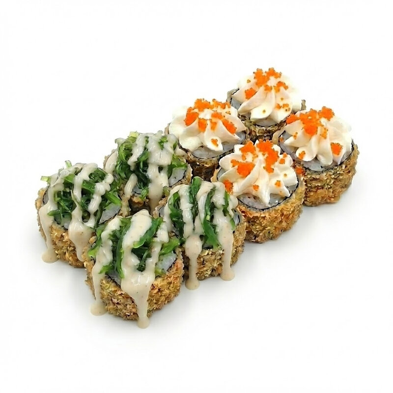 Тигровая креветка в панировке, сливочный сыр, зеленый лук, соус терияки, соус спайси