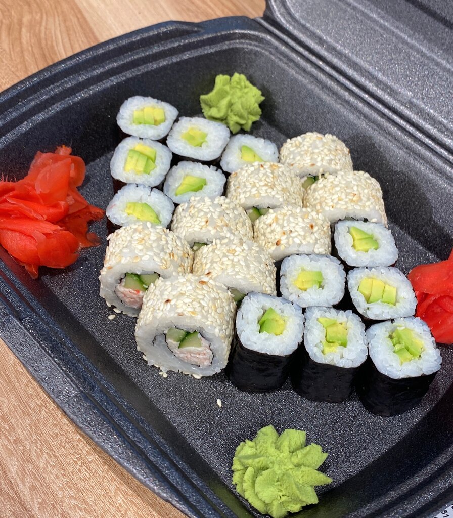 Ролл Калифорния, ролл Калифорния с лососем терияки, ролл с авокадо. Имбирь, васаби и соевый соус не входят в заказ