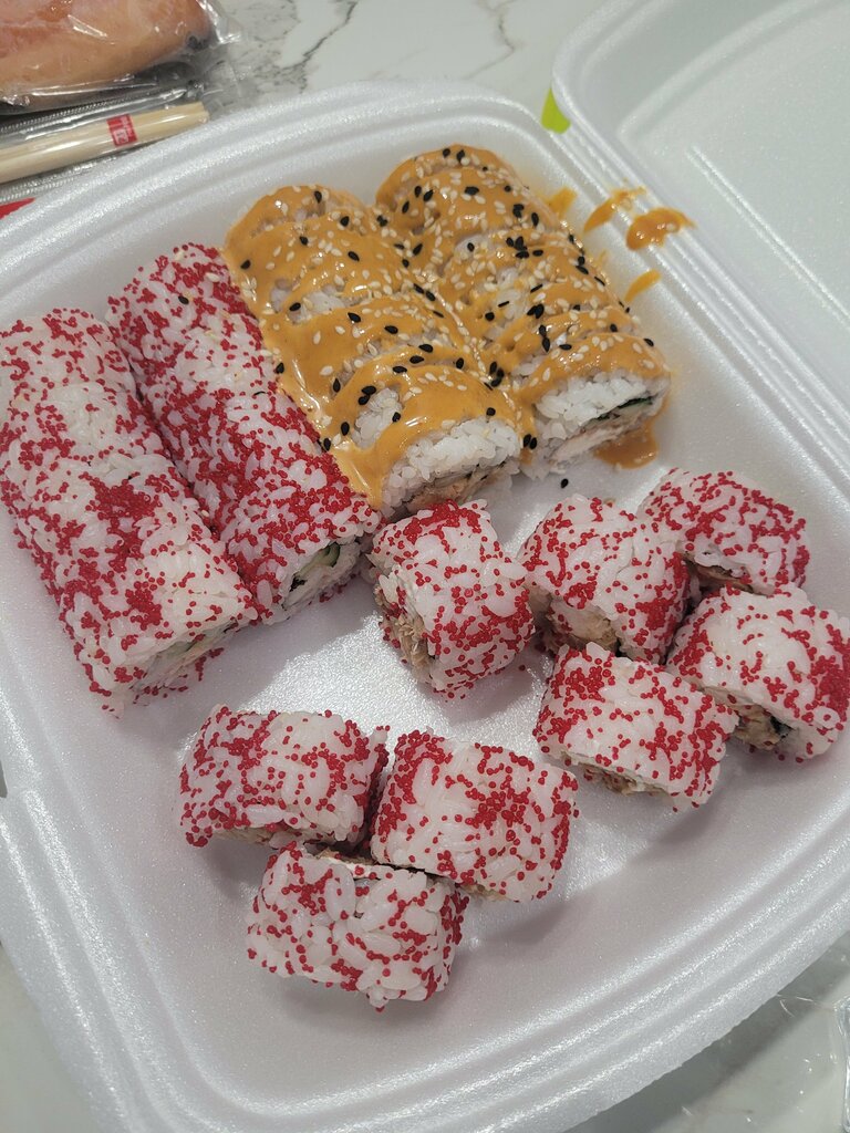Ожидание-реальность. Заказала 07.09.2023 по телефону 2 ролла, сочная креветка и ролл с авокадо. Девочка на приёме заказов не очень была расторопна. Задавала лишние вопросы. Например. Говорю. Ролл с авокадо. Она-какой именно. Говорю - так и называется, ролл с авокадо. Она долго не могла понять про что я и потом искала его долго. Доставка минут 50. Сами роллы жесть. Один сливочный сыр и 2 см креветки. На одном 1 см креветки сверху. На фото на сайте креветка как бы обвалакивает минимум наполовину ролл. В разрезе икры почти нет. На одном разрезе ноль. Второй ролл со странным цветом авокадо. Рис неплох. В общем на вид так себе. На вкус на 4 с минусом. Правда имбиря было много. Заказывали с другого номера 1 сентября 2023 года. Том ям был со свернувшимися сливками. В общем заказывать больше не буду.