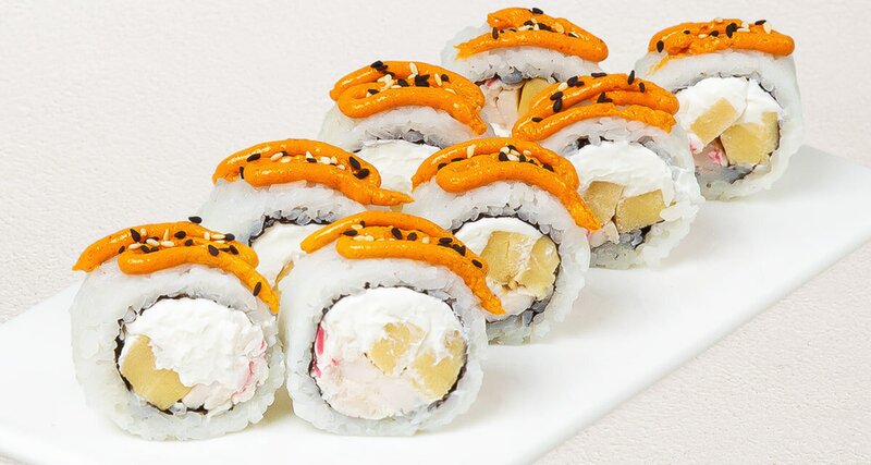 Краб-крем, омлет тамаго, масаго, сырный соус, унаги соус, кунжут. Имбирь, васаби и соевый соус не входят в заказ