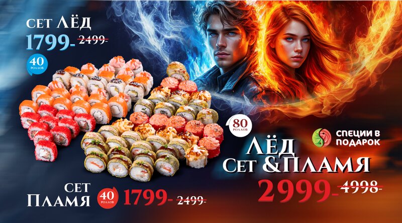 Филадельфия Классика 10шт, Унаги Филадельфия такуан 5 шт, Калифорния с лососем 10 шт, Ролл Мияги 10 шт, Ролл Сяке такуан 5 шт, Сяке темпура 8 шт, Унаги темпура 8 шт, Лава гриль 8 шт, Темпура хот 8 шт, Калифорния гриль 8 шт. Специи ( соевый соус, имби