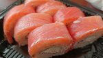 Свежий лосось, сливочный сыр. 280 грамм. Белки - 9,5, жиры - 7,7, углеводы - 19,6, Ккал - 186.