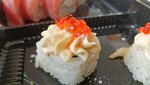 Крабовое мясо, сливочный сыр, тар тар из лосося, зеленый лук, соус терияки, икра тобико, икра масаго. 260 Грамма. Белки - 8,9, жиры - 5,4, углеводы - 21. Ккал - 168,2.