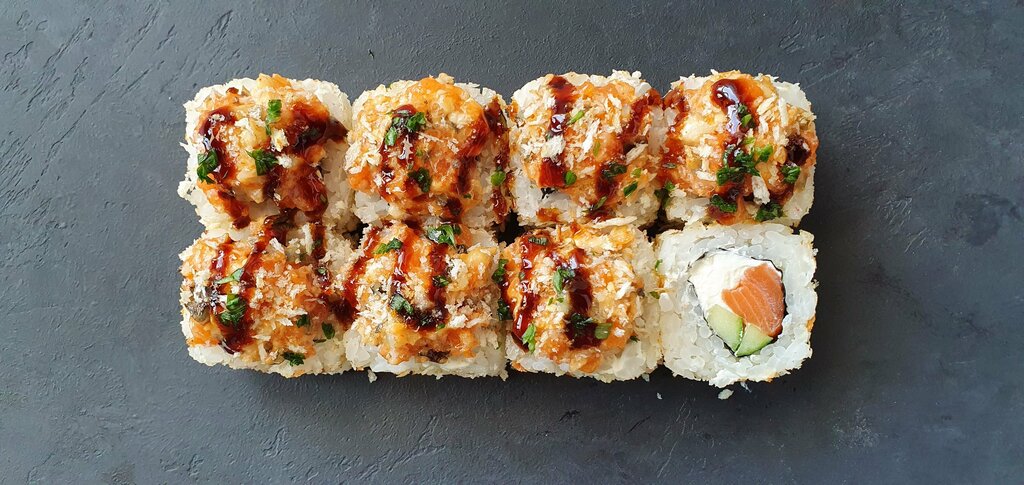 Лосось, сливочный сыр и огурец, обжаренные в хрустящих сухарях панко. Лёгкий и сочный ролл темпура для любителей нежной текстуры.