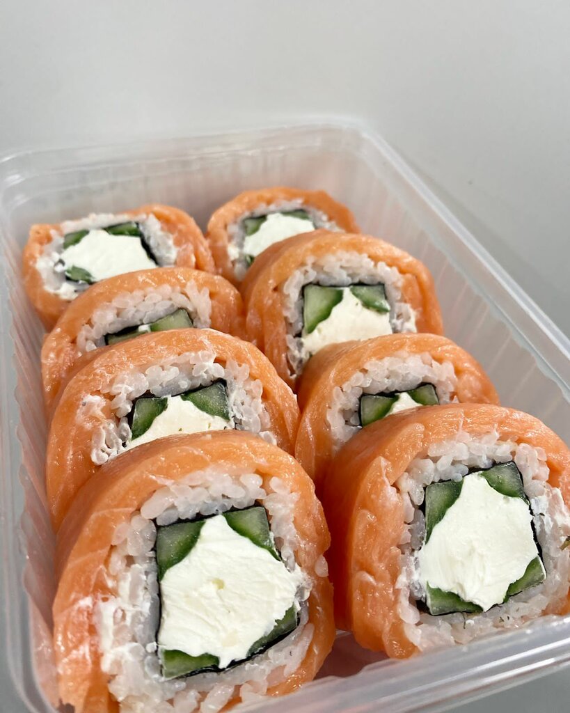 Состав: суши рис, нори, сливочный сыр, лосось, огурец.