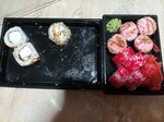 Суши отвратительные. Размер огромный, но рыба практически отсутствует, только рис и сыр со вкусом крахмала. Салат с чукой, на удивление, был совсем с другими водорослями и на вкус сделан из ваты. Ещё и доставка приехала с опозданием на 40 минут.