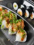 Краб, сыр, огурец, рокфор, унаги-соус, кунжут