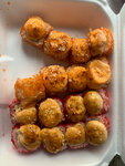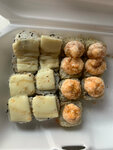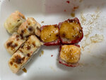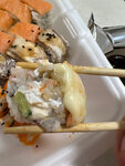 Переваренный рис, раздавленные пальцем ? роллы. Как на вид так и на вкус не очень( Один соус ощущается. Имбирь не положили, васаби. Только соус и палочки. Сервировка оставляет желать лучшего. Не советую тут заказывать роллы… Прилагаю картинку того, что было обещано и что в итоге получила 🤢