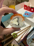 Заказал через Яндекс еду, Калифорния с лососем и запечённый Киото. Курьер пришёл без термосумки, просто пакет, запечённый ролл - холодный, ну это заслуга доставки, ладно. Калифорния - я просто не увидел начинки, её было настолько мало, что я когда её разглядывал, был похож на того китайца, который щурится на маленький листочек. Запечённый ролл - начинки больше, но соус, который был сверху просто жирный майонез с приправами и всё, чтобы просто добавить вкуса. Я приехал домой после тяжёлого рабочего дня, голодный, просто затолкал в себя рис с майонезом и был таков. Цена - качество, просто ужасно, 1100 рублей потратил на что-то (