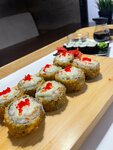 креветка темпура, икра масага красная, лист салата, огурец, сырно-чесночный соус, кунжут (194 гр)