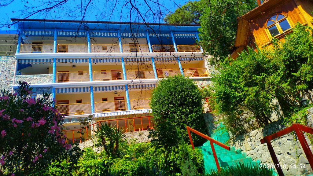 Осталась довольна отдыхом. Расположение отличное, до моря 260 ступенек) рядом с гостиницей остановка автобуса, можно доехать куда угодно. Прямо напротив гостиницы санаторий Дюльбер с красивейшей территорией и отличным пляжем ( платным), в 20 минутах ходьбы другой пляж, бесплатный, в Мисхоре. Сам номер очень продуманный, санузел выходит на солнечную сторону, благодаря чему быстро все просыхает, а окно самой комнаты наоборот на север, поэтому там всегда прохладно и темно. Интернет всегда есть, вода горячая и холодная тоже всегда есть. Кондиционер работает. Мебель добротная, в номерах чисто. Есть места для просушки мокрых купальников)) Хозяева Николай и Надежда очень доброжелательные, сразу приходят на помощь, решают все твои проблемы. В гостинице есть общая кухня со всем необходимым, можно готовить самому. Но самое для меня прекрасное в этой гостинице - это вид с балкона. Море, деревья, купола Дюльбера, шум горной речки поблизости. Вечера, проведенные в кресле на балконе, я вспоминаю как самые счастливые мгновения отпуска.