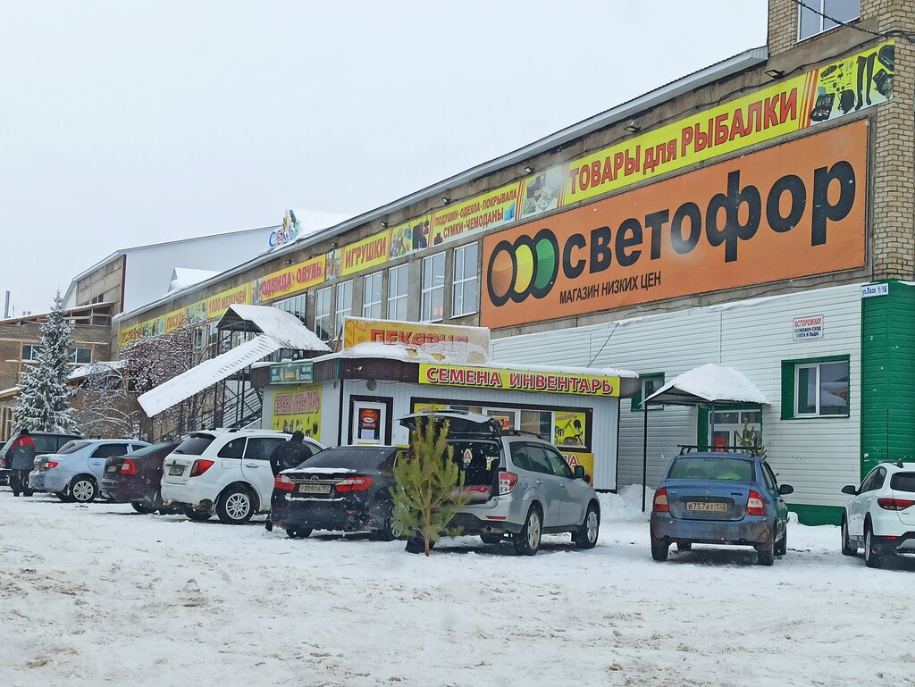 Светофор как светофор, наверно расписывать товар смысла нет - ассортимент всегда разный, качество тоже. Надо приходить и смотреть. Большая парковка, но ужасное дорожное покрытие. В одном курмыше и светофор и магазин "Семья". Можно пока ходишь шопиться сдеть машину на соседствующую автомойку
