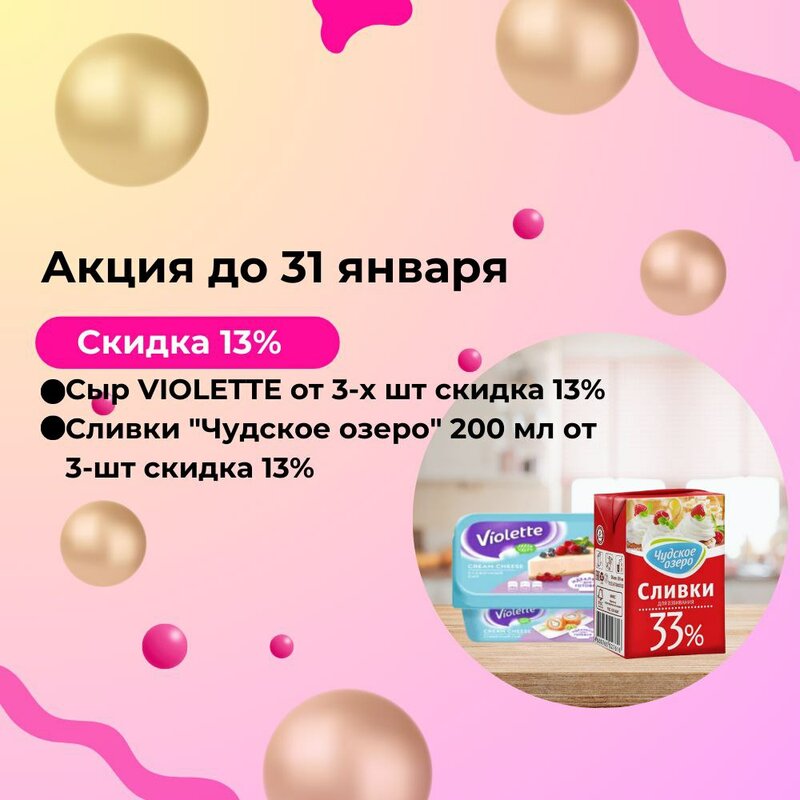 Первая акция в 2026 году! Успейте выгодно запастись основой для ваших десертов: 🧀 Сыр VIOLETTE — скидка 13% при покупке от 3 шт. 🥛 Сливки ...