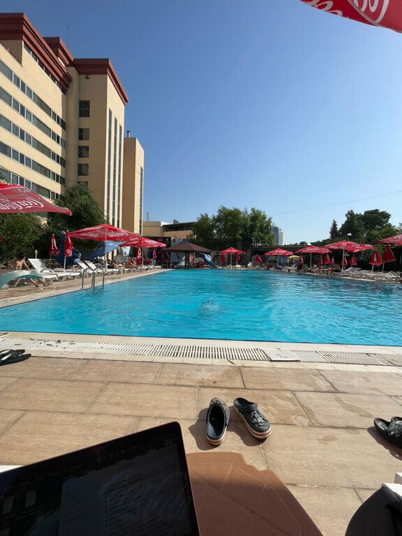 We started going to this pool a long time ago, and now we walk intermittently by inertia, because it is next to the house. It feels like they decided not to invest any more money in the pool at all, everything is dilapidated, nothing is being updated. half of the umbrellas are already broken, those that remain are simply fixed with piled fragments of concrete tiles, in the wind this whole structure collapses, which is simply unsafe. There are piles of junk everywhere in the corners - pieces of artificial lawn, old umbrellas, chairs. The tiles around the pool are dirty, the bowl is also tired, etc. If even that year the staff was more or less active, then this year they sit and chill in the shade, they have to go catch themselves. Today we have been sitting for 3 hours, no one has even offered the menu, we put the fallen umbrellas ourselves. But in general, you will come before 11-12 o'clock, you will swim alone, then abruptly at 12 people rush in, and on any day of the week. And a cloud of small midges that bit everyone. In the evening, it is better to go without children, by 5 p.m., some hotel guests, and visitors are specifically so pumped up in the bar, well, they perform who's what🤪