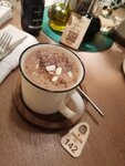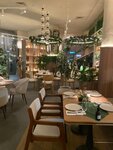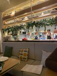 Заведение на троечку. Зашли с женой на обед. На входе встретили хорошо, сразу забрали куртки в гардероб — приятно. Место внутри на вид симпатичное: светло, зелено, всё в мягких тонах. Но как сели — стало как-то тесно и душновато. Кондиционеры вроде работают, но воздух тяжелый. И ощущение, что все эти милые детальки — вазочки, специи, украшения на столах — так старательно всё расставили, что стало перегружено. Хочется вдохнуть свободно, а не получается. Меню не удивило — всё стандартное, как в десятке других мест. Выбрали пиццу «Страчателла и Мартадела», клюквенный морс, фруктовый чай «Имбирь-каламанси» и лимонный пирог на десерт. Пицца в целом норм. Начинка — действительно вкусная, сыр тянется, всё сочно. Но есть минус и это тесто. Онопресное, особенно корочка. Жуешь и думаешь: за эти деньги можно было взять две отличные пиццы из любимой доставки. Не тянет. Морс — обычный, хороший, как и должен быть. А вот чай меня подвел. Спрашиваю у официантки: «Он сладкий? Не хочется сладкого». Мне дважды говорят: «Он с остринкой». Приносят — а он приторно-сладкий! Зачем тогда спрашивать? Пирог лимонный, с меренгой — сам по себе отличный, кисло-сладкий. Но его после этого чая есть невозможно — вся кислинка пропала. В общем, место так себе. Не плохое, но и не хорошее. Пообедать можно, если других вариантов нет. Но специально идти сюда — нет, не стоит. Цены явно завышены за атмосферу, которая в итоге давит, и за блюда, которые не дотягивают. Жаль.