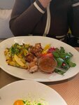 Новый интересный ресторан, чисто, красиво. По еде богатый выбор меню. Салаты вкусные, подача блюд на высоте, порции не маленькие. Шашлык показался суховат на 4+, рыба понравилась. Посетителей много, контингент разнообразный. Пока - это больше семейное место, а не пафосный ресторан, но время покажет какой путь выберут владельцы.