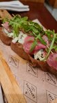 Вы знаете, это моя 2-я сыроварня, первая случилась в Депо фуд Молл, там всё прекрасно. И если сравнивать, то эта на Красном октябре проигрывает конечно «деповской» и интерьером, и обслуживанием. Зашла перекусить одна, мест не было, но это не важно, я согласна была сесть за барный стол. Заказ был сделан быстро, брускетта и бокал игристого со льдом. Бокал принесли быстро, лед принёс третий официант, 2 предыдущих куда то пропали. Брускета вкусная, но листьев можно было и не жалеть. Мелочи, но как то осадочек остался.