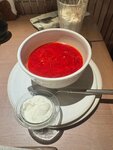 Классический борщ на говяжьем бульоне с бородинским хлебом, салом, зеленым луком и сметаной