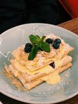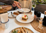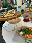 Не впечатлило, если честно. Заранее бронировала столик на террасе. Посадили в самый конец зала (хотя весь вечер оставалось много свободных столиков), где не особо уютно, а из курилки тянется дым и разлетается пепел (пришлось самим оттирать его от стола влажными салфетками, чуть не испачкала белую блузку). Поменяли стол- там всё то же самое. Еда очень посредственная для такой стоимости: брускетта холодная и невкусная, с вялой горчащей рукколой; фокачча сухая, сыры не особо впечатлили. Неплохой был форшмак, фруктовый чай, лимонад и пирожное «птичье молоко».