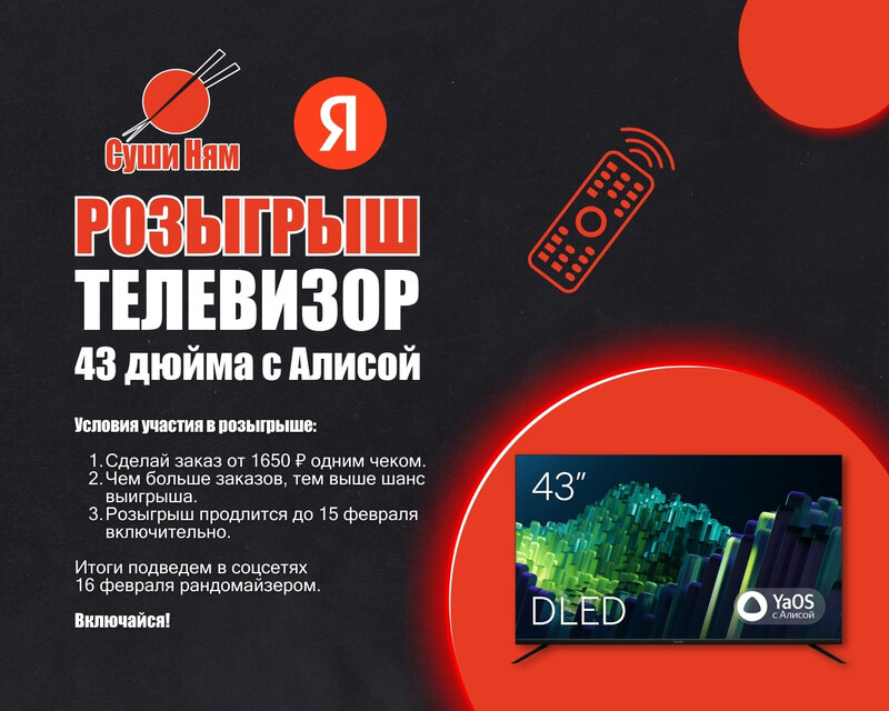 🎉 Крупный розыгрыш от Суши Ням — разыгрываем телевизор! Мы решили порадовать вас по-настоящему большим призом. В этом розыгрыше — телевизо...