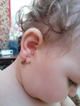 Я в бешенстве!!! 17 декабря ребенку прокололи уши 1 год. По истечению 2х месяцев вставила сережки (так сказал специалист) и вижу что сережки на разном уровне!!! Прокололи не ровно... Спрашивается за что берут такую сумму?? Я отдада 2500.?!!! Вопрос к руководству?? Как будем исправлять эту ситуацию?? Фото прилагаю. Если смотреть на яблочко то видно одно яблочко ложится на мочку на другом ухе под мочкой!!!!