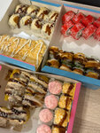 Variety of food:sushi and rolls, sweets, pizza, сhinese food