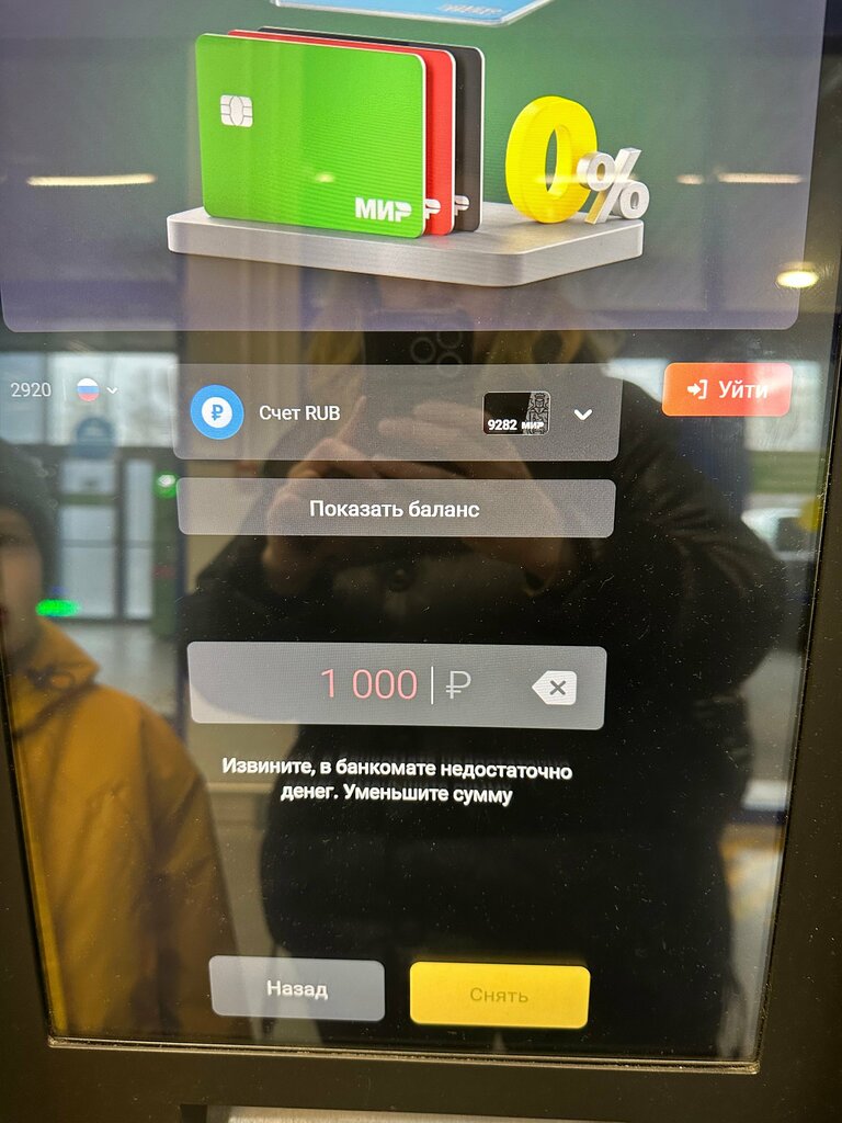 2 банкомата на город Истра, ни в одном нету наличных, хотела снять, даже 1000 рублей нету. Безобразие!!!!!!