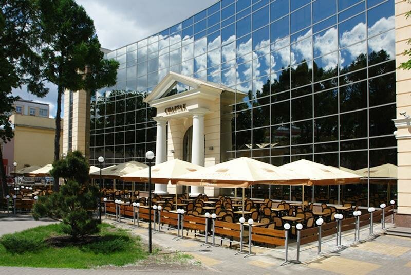 расположено на территории кинотеатра Спартак, уютный интерьер, есть отличная и большая летняя веранда, приемлимые цены, внимательные официанты.очень вкусная пицца Ди Мара из морепродуктов!
