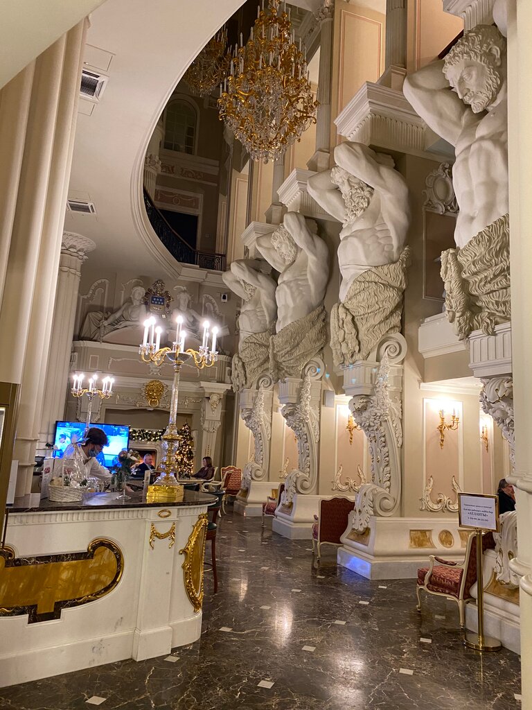 Атмосфера отдыха с прогулками по дворцовым этажам и лабиринтам отеля, в глазах отдельный стеклянный лифт плавно приземляется на шикарный завтрак с верхнего этажа вниз и потом обратно с обзором на память белоснежного обеденного зала как "с высоты птичьего полета" и "без потолка"... В воскресенье с 9ч здесь на завтраке за бокалом шампанского, поднесенного элегантными стройными официантами, и икрой со шведского стола, умиротворения добавляет знакомые ретро мелодии красивого седоволосого пианиста, который с пятницы с 19ч до 21ч играет также играет и в лобби отеля на белом рояле с ещё большим репертуаром... и бег проходящих гостей отеля на вход и выход замедляется, присаживаясь в кресла... Есть возможность зайти с улицы в бар лоби в это время, чтоб создать себе праздник для души и выпить кофе под звуки рояля сладких мелодий... Красиво все, и музыка, и интерьер, и дизайн коридоров и шикарная лестница. Номера в старинном стиле с декором классики. Обилие картин. Наследие купцов Елисеевых хозяин отеля сохранил в достойном виде. Спасибо.