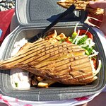 Нашли по отзывам, перепробовали почти всё. Брали и шаурму с курицей, и шаурму с говядиной, бутеры с говядиной, боксы с говядиной и боксы с курицей, покупали просто курицу гриль. Особенно понравились боксы с говядиной, которая просто тает во рту. Порция большая, готовили при нас, по желанию можно сделать поострее. Проблем с пищеварением ни у кого не было. На фото бокс с курицей.