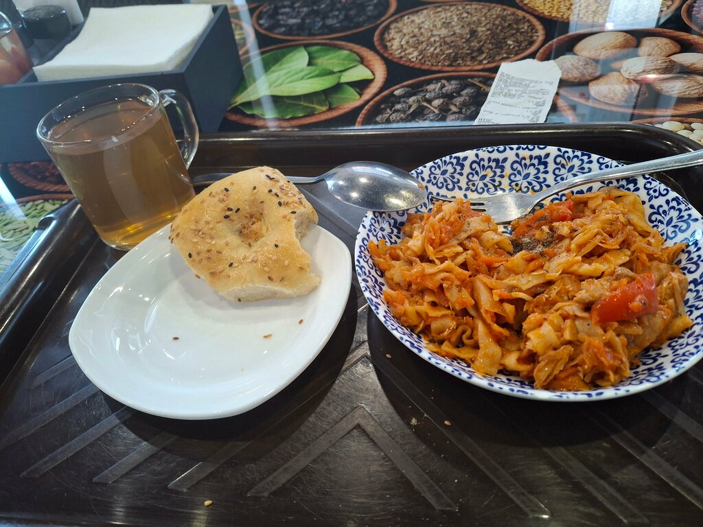 Вчерашние блюда не советую употреблять , спасибо за честность кассиру. Заказал каурма-лагман -в итоге подали варёную лапшу в перемешку с подливом и мясом , порция не большая , прошу изменить рецепт приготовления каурма-лагман. Лепёшка и компот норм. Спасибо. Фото прикрепил