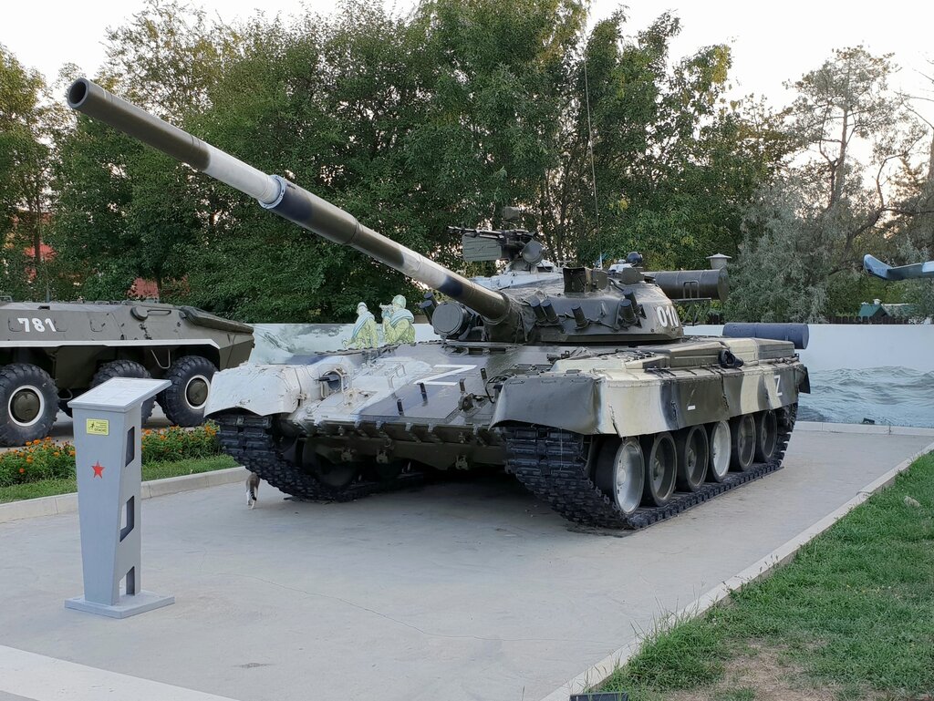 Особое внимание посетителей Сквера военной техники привлекает этот танк. Особенно усердствуют дети, которые лазиют по нему везде, где можно)) 6 июля 1976 года, на вооружение Советской армии был принят основной боевой танк (ОБТ) Т-80. Боевая машина создана в специальном конструкторском бюро (СКБ) транспортного машиностроения при ленинградском Кировском заводе группой конструкторов под руководством Николая Попова. Первая серия танков Т-80 была выпущена в 1976-1978 гг. Главной особенностью Т-80 явился газотурбинный двигатель, который использовался в качестве силовой установки танка. На некоторых его модификациях установлены дизельные двигатели. Танк Т-80 и его модификации отличаются высокой скоростью движения (до 80 км/ч с экипажем из 3 человек). Танк Т-80 – предназначен для ведения наступательных и оборонительных боев в различных физико-географических и погодно-климатических условиях. Для огневого поражения противника Т-80 вооружен 125-мм гладкоствольной, стабилизированной в двух плоскостях пушкой и спаренным с ней 7,62-мм пулеметом ПКТ; 12,7-мм зенитным пулеметным комплексом "Утес" на командирской башенке. Для защиты от управляемого вооружения на танке установлена система пуска дымовых гранат "Туча". Танки Т-80Б оснащены комплексом ПТУР 9К112-1 "Кобра", а Т-80У - ПТУР 9К119 "Рефлекс". Механизм заряжания аналогичен с танком Т-64. В систему управления огнем Т-80Б входят лазерный прицел-дальномер, баллистический вычислитель, стабилизатор вооружения и комплект датчиков для контроля скорости ветра, крена и скорости танка, курсового угла цели и др. Управление огнем на Т-80У дублировано. Изучаем историю городов России вместе!