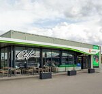 Большая и удобная заправка автомобиля. Огромный ассортимент сопутствующих товаров. Можно перекусить в кафе, попить вкусный кофе. На территории есть автомойка.