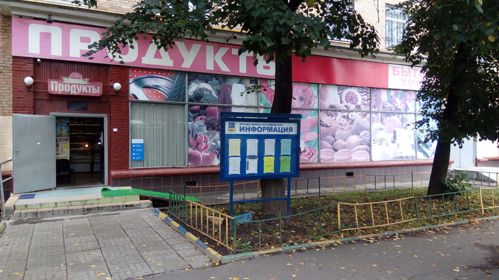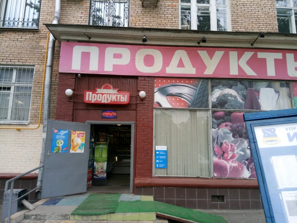 Магазин продуктов, есть не только продукты питания, но и бытовая химия, алкоголь и сигареты. Можно расплатиться картой