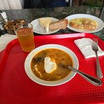 Еда вкусная, кухня на любой вкус, цены максимально бюджетные. За всё что на фото, я отдал 420 рублей. А это солянка, пюре с куриной котлетой и колбаской и пару кусочков хлеба, и на десерт чизкейк и компот.
