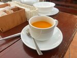 В общем и целом место хорошее, но как буд-то бы застывшее во времени (в 90-х годах) - это касается интерьера. Здорово, что есть второй этаж, там интересно и видно улицу. Но столы и стулья, это что-то. Давно не видел я таких деталей интерьера, но может и есть любители, а нам крашенная мебель не зашла. Что касается кухни, то она по-хорошему удивила. Баклажаны в салате радовали, рыбка не фантастическая, но достаточно хорошая, а чай насыщен и ароматен. Сервис на хорошем уровне, нас устроил. Впечатления остались положительные. Спасибо.