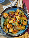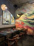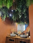 Красивый интерьер, зонирование, несколько залов. В жаркий день очень душно, но тут как всегда, когда одним гостям дует, другие изнывают от духоты. Официанты приятные, но это не команда. Каждый сам за себя. Нельзя попросить другого официанта сделать что-то, отговорка "позову вашего". И ждёшь. Кухня. Отправила вопрос на кухню о точном составе блюда, потому что точно знаю, что в классическом рецепте кинза. Прям уверяли меня, её там нет, там мята. Ну ок. Приносят, пришлось отдать другу, там кинза 100%. Все едят, а я ещё 20 минут жду... Не соблюдают курсы подачи вообще. На компанию, 6 гостей, кому-то сразу и салат и горячее принесли, а кто-то сидит 30 минут ждёт. В общем, не повезло мне в этот раз