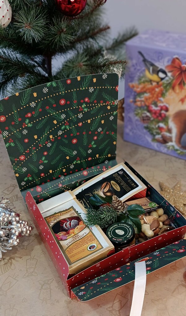 В составе: черный чай Царский 50 г., зеленый связанный чай Лунный сад 1 шт., кофейные зерна в шоколадной глазури в жестяной баночке 60 г.