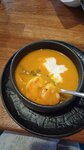 Есть интересные виды чая. Вкусные гренки и картошка фри. Понравился тыквенный суп-пюре. Только фрикадельки сомнительные: сухое мясо под классическим советским соусом. Красивое оформление.