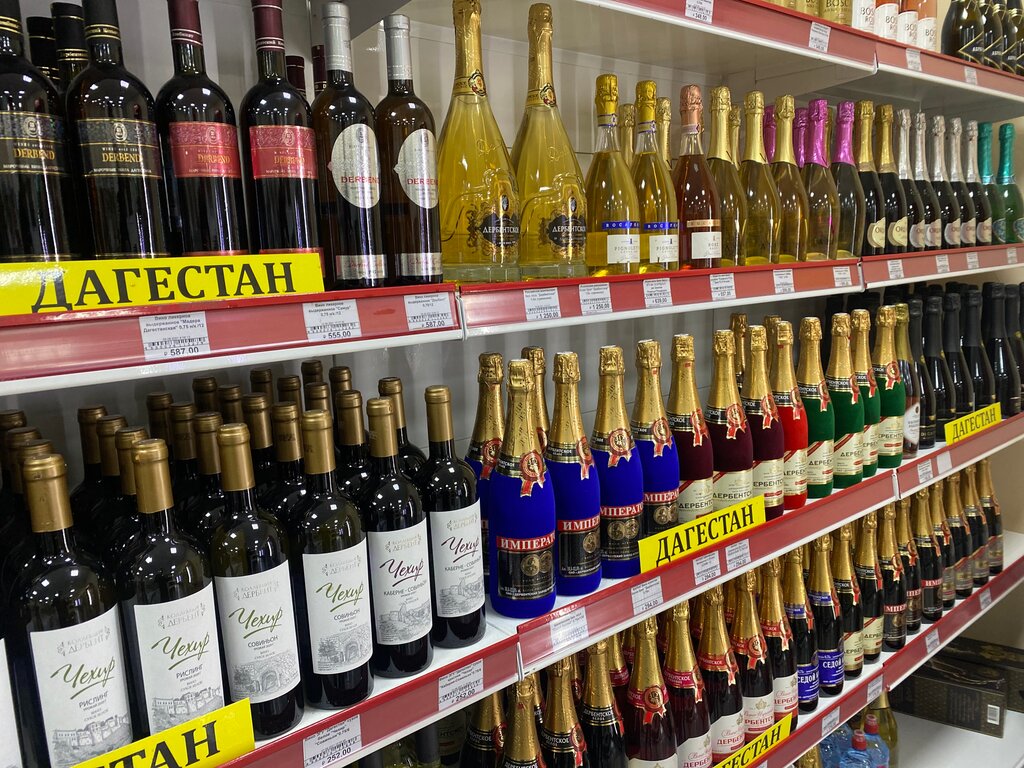 Большой выбор алкоголя, есть вина Молдавии, Грузии, Армении которых в России уже не встретишь. брал продукцию местного дербентского завода. пробовали шампанское качество обычное. Как и в любом российском магазине.